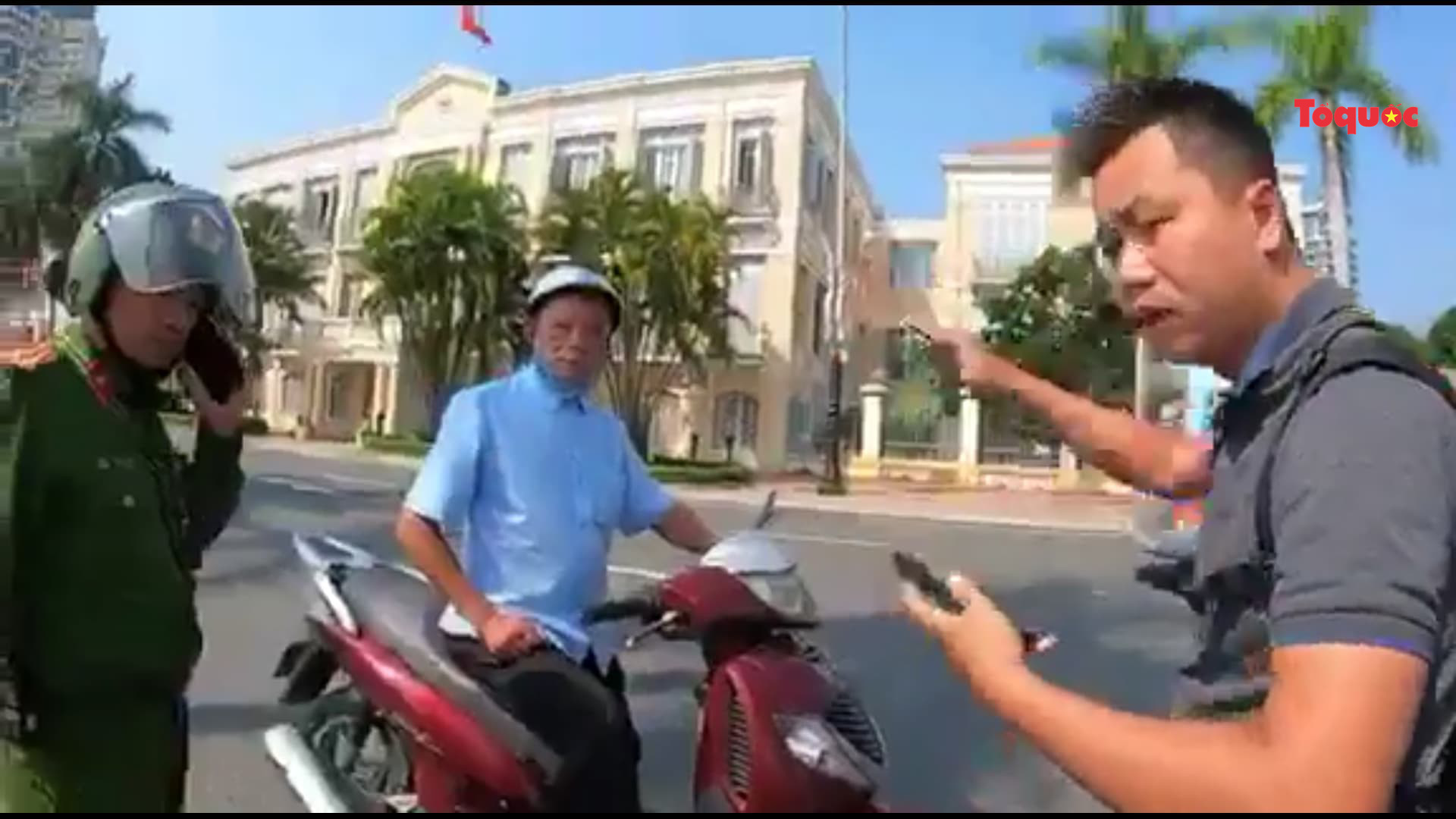 Vũ Tuấn A. (ngoài cùng bên phải) vu khống "công an đánh người" sau khi vi phạm Luật giao thông. Ảnh cắt từ clip